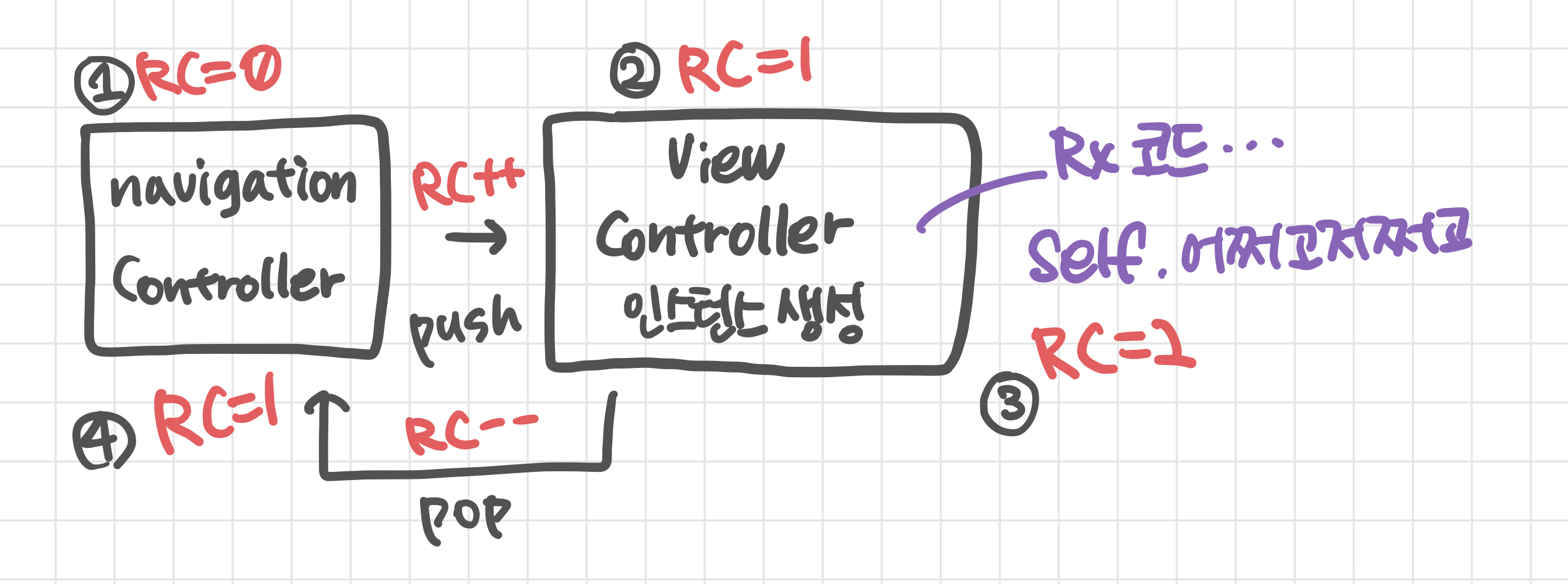 * ์๋ ๊ทธ๋ฆผ์์ ViewController๊ฐ ํ๋ฉด์์ pop ๋๊ณ ์ด์ ์ฌ์ฉํ์ง ์๋๋ฐ๋ ๋ถ๊ตฌํ๊ณ 3๋ฒ์ self.์ด์ฉ๊ณ ์ ์ฉ๊ณ ์ฝ๋์ ์ํด RC ์นด์ดํธ๊ฐ ํ ๋ฒ ์ฆ๊ฐ๋์๊ธฐ ๋๋ฌธ์ 4๋ฒ์์ RC = 1์ด ๋จ. ViewController์ ์ธ์คํด์ค๊ฐ ๋ฉ๋ชจ๋ฆฌ์์ ํด์ ๋์ง ์์!!!! → ๋ฉ๋ชจ๋ฆฌ ๋์(Memory Leak)